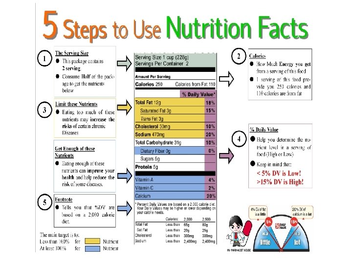 The % Daily Value is a key to a balanced diet. The % DV is a general guide to help you link nutrients in a serving of food to their contribution to your total daily diet. It can help you determine if a food is high or low in a nutrient— 5% or less is low, 20% or more is high. You can use the % DV to make dietary trade-offs with other foods throughout the day. The * is a reminder that the % DV is based on a 2, 000 -calorie diet. You may need more or less, but the % DV is still a helpful gauge.