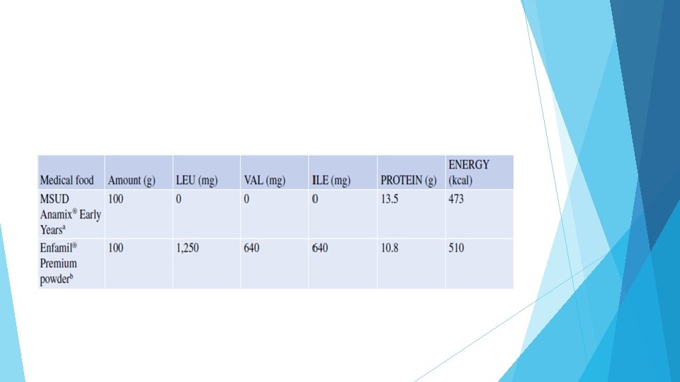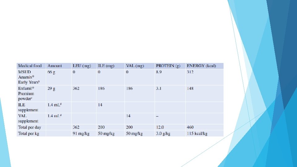 Initiating Nutrition Management of an Infant with MSUD Goal : Reduce or normalize plasma leucine Stepby-step : 1. Establish intake goals based on the infant’s diagnostic blood leucine, clinical status, and laboratory values. 2. Determine amount of standard infant formula or breast milk required to meet the infant’s leucine needs. Determine the amount of protein and energy that will be provided by this amount of formula.