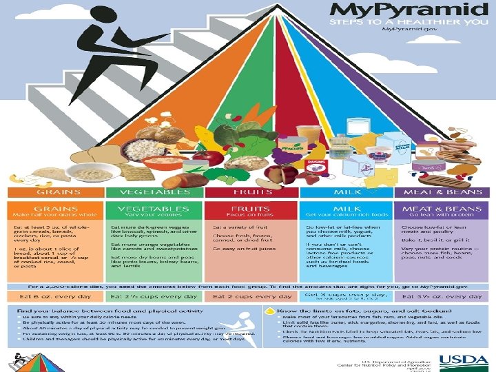 Nutrition • Water – Drink at least eight 8 oz. Glasses per day. Other drinks that contain water don’t equate. • Minerals – The body needs minerals, the best way to get them is to eat a balanced diet • Vitamins –The body needs minerals, the best way to get them is to eat a balanced diet • Carbohydrates 45%-65% daily intake look for complex carbohydrates (breads, pastas, fruits, veggies, cereal) Avoid simple carbs (cookies, soft drinks, etc. ) • Fats 20%-35% of your Daily calories should come from fats; keep your intake of saturated fats low (butter, whole milk, cheese, ice cream, etc. ) 7% per day. • Proteins 10% -35% per day. Fish, beans, peas, grains, nuts, etc.