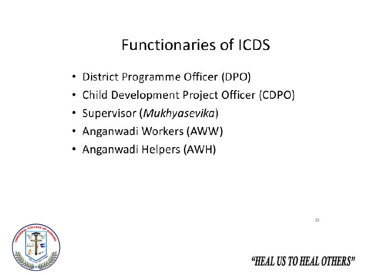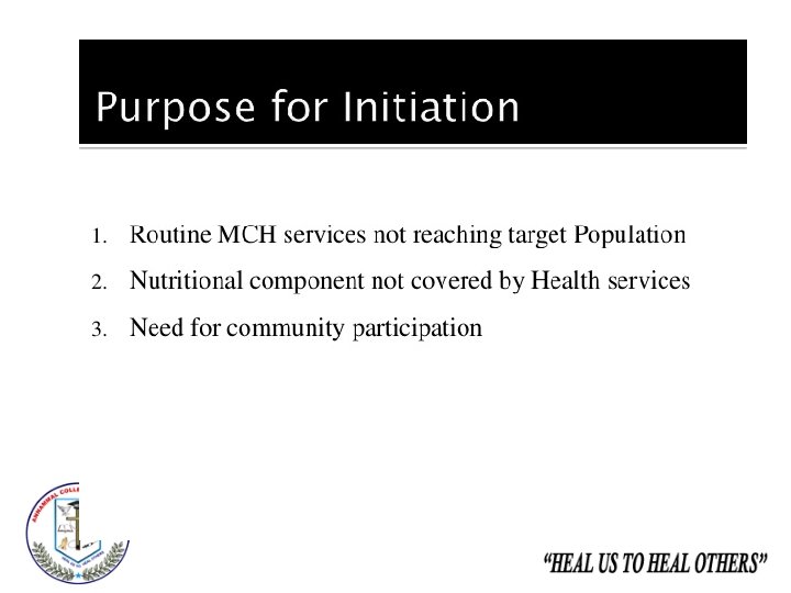 Services : • It provides üNutritional Education. üNutrition worth of 25 paise per child per day and 50 paise per woman per day are provided for 52 days in a year. The nutritional Education was the main focus and efforts were directed to teach rural communities through demonstration how to produce food for their consumption through their own efforts. Major Components : • Nutritional Services • Health Service • Communication • Monitoring and Evaluation