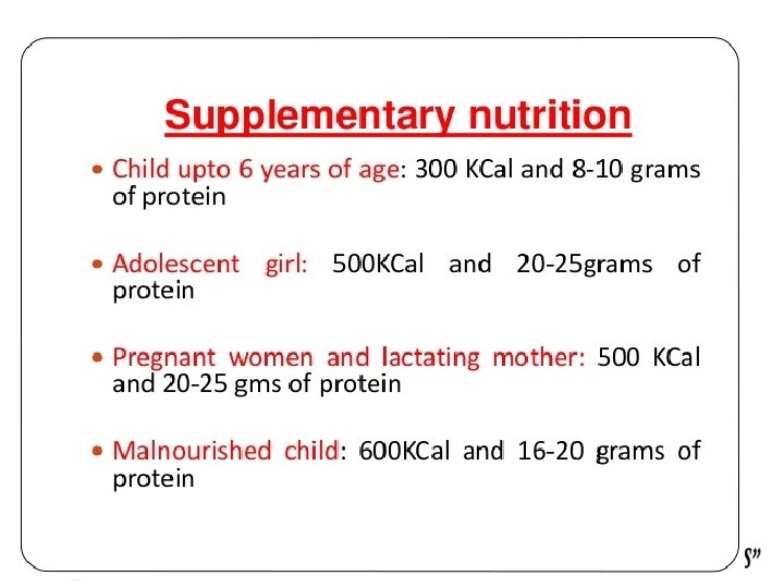 Beneficiaries 1. 2. 3. 4. Children less than 3 years Children between 3 -6 years Pregnant and lactating women Women in the reproductive age group (15 -44 years) 5. Adolescent girls (11 -18 years)