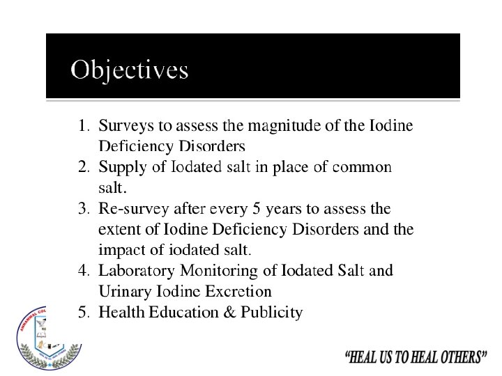 IODINE DEFICIENCY DISORDER CONTROL (IDDC) PROGRAMME • National goiter control programme was started in 1962. • Renamed it on 1992 as National Iodine Deficiency Disorder Control (IDDC) Programme