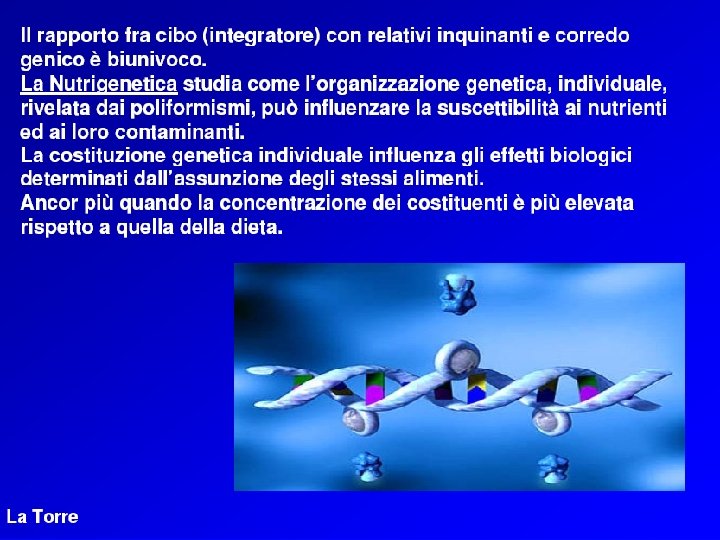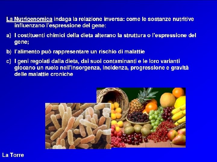 Un regime alimentare ben scelto migliora la situazione in maniera considerevole agendo su diversi parametri: Ø ristabilimento di una flora batterica fisiologica e riduzione delle molecole batteriche pericolose. Ø consumo di alimenti compatibili con gli enzimi e le mucine dell’intestino tenue, dunque riduzione delle molecole alimentari pericolose. Ø riparazione dei disturbi degli enterociti conseguente recupero dell’impermeabilità della mucosa intestinale, fatto sufficiente per impedire il passaggio della maggioranza delle molecole nocive. La Torre
