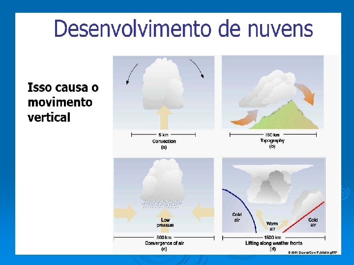 Desenvolvimento de Nuvens Os movimentos verticais mais importantes que ocorrem na atmosfera são: convecção, ascensão turbulenta, ascensão orográfica e ascensão lenta sobre vasta área.