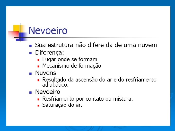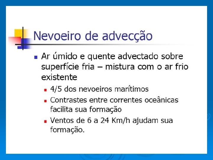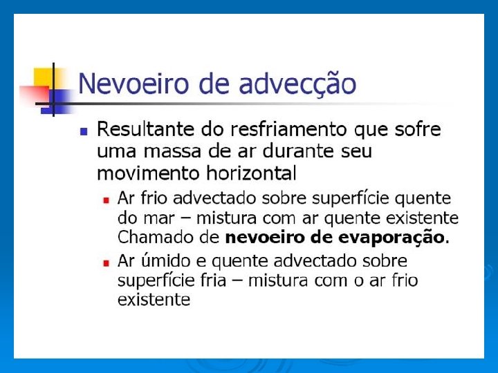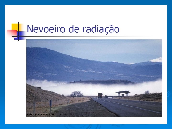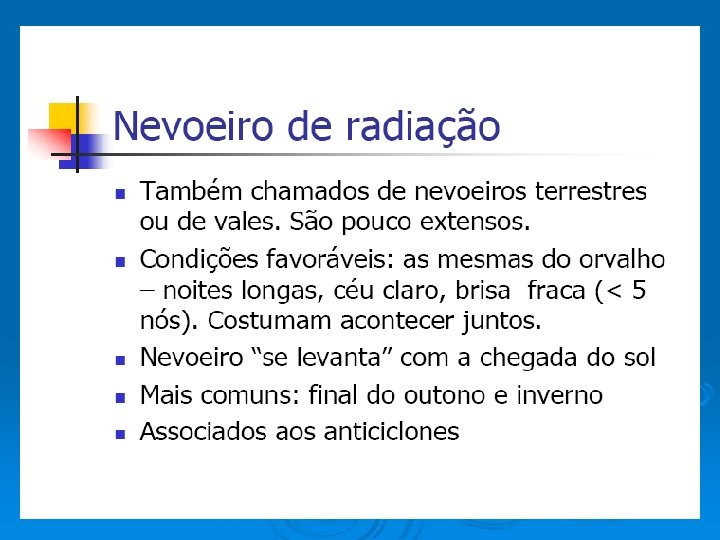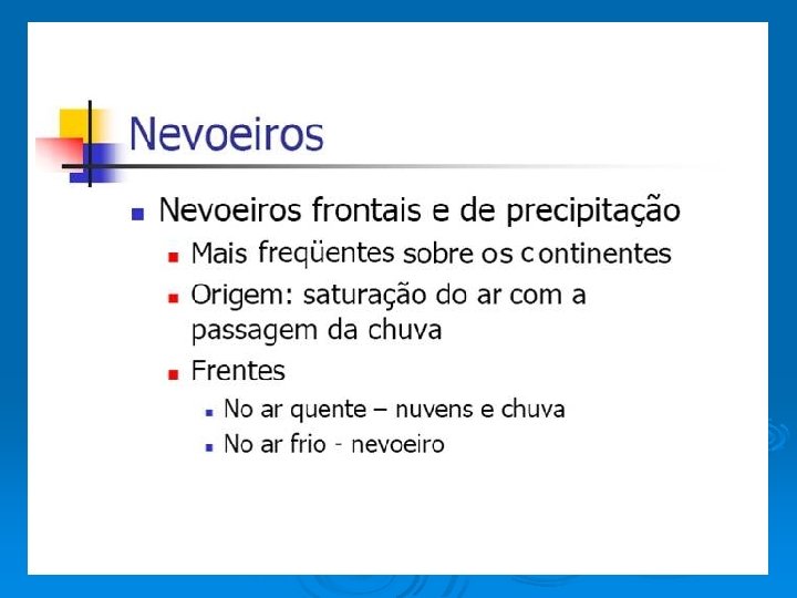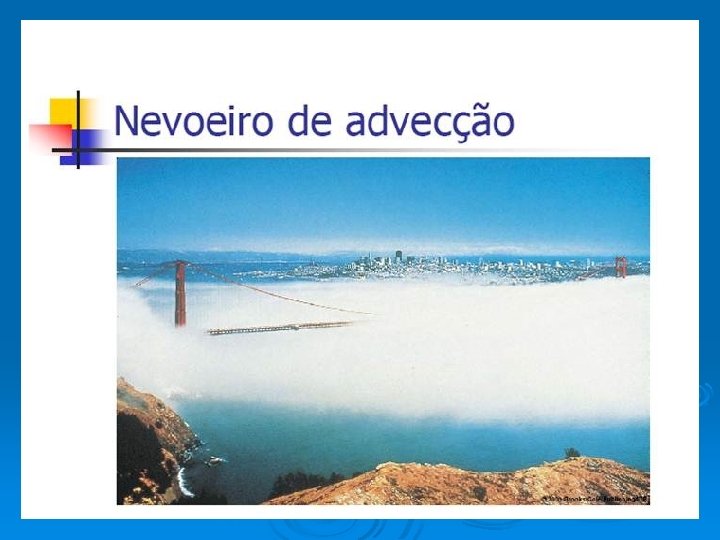 TIPOS DE NEVOEIROS • Nevoeiro de radiação • Nevoeiro de advecção • Nevoeiro de evaporação • Nevoeiro de precipitação Nevoeiros Frontais