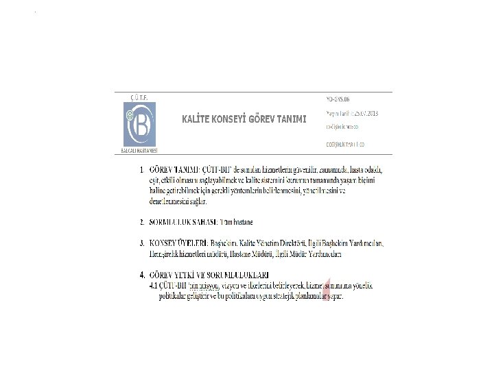 Kalite Yönetim Sistemi Dokümantasyonu q Vizyon, misyon, kalite politikası, organizasyon, g/y/s. . q Kalite El Kitabı q Prosedür, talimat, form, protokol, bakım haritaları, klinik kılavuzlar, akış şemaları, yönetmelikler v. b. q Kalite Kayıtları