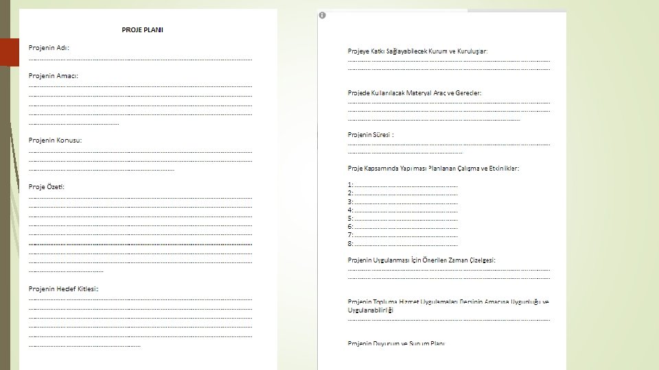 Projeyi Planlarken Kendimize Sormamız Gereken Sorular Nelerdir? Neden topluma hizmet projesi yapmalıyım? Hangi projeyi yapmalıyım? Projede kimlerle birlikte yer almalıyım? Projeyi nasıl planlamalıyım? Projeye katılımı nasıl sağlamalıyım? Proje tamamlandığında nasıl sunmalıyım? Proje bittikten sonra sürekliliğini nasıl sağlamalıyım?