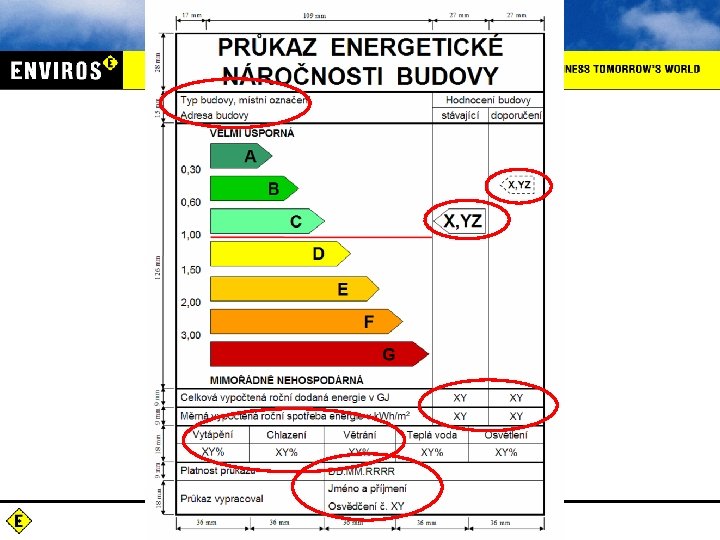 Obsah a forma průkazu ENB Průkaz energetické náročnosti budovy – GRAFICKÉ ZNÁZORNĚNÍ Ø typ budovy, místní označení a adresa budovy Ø klasifikační třída budovy podle bilančního hodnocení Ø klasifikační třída po provedení doporučených opatření na snížení ENB Ø celková vypočtená roční dodaná energie v GJ Ø měrná vypočtená roční spotřeba energie v k. Wh/m 2 Ø dodaná energie pro pokrytí dílčích potřeb spotřeby energie budovy v % Ø platnost průkazu ENB Ø jméno zpracovatele průkazu s identifikačním číslem