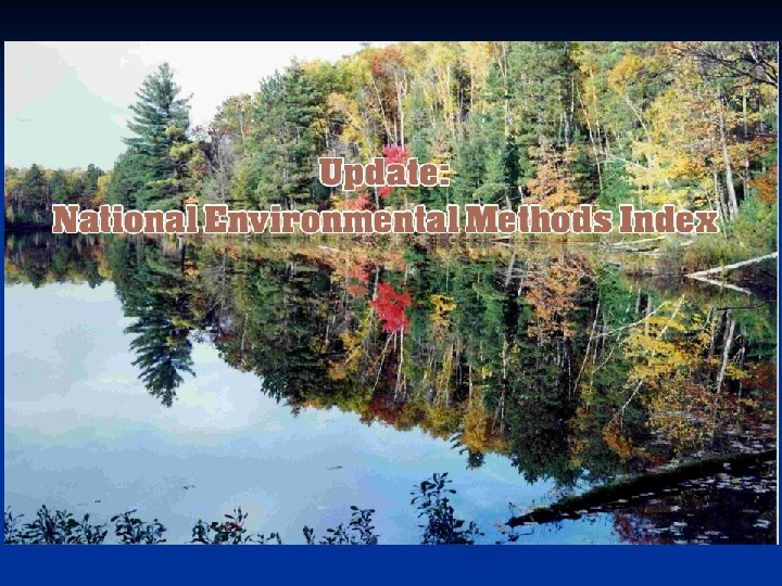 Green Methods Update n n ACS Petroleum Research Fund grant to Green Chemistry Institute n Developed scale of “relative” greenness and applied to methods in NEMI n Article on green methods in Chem Review prominently mentions NEMI (Authors: Larry Keith and others) Will be going live fairly soon