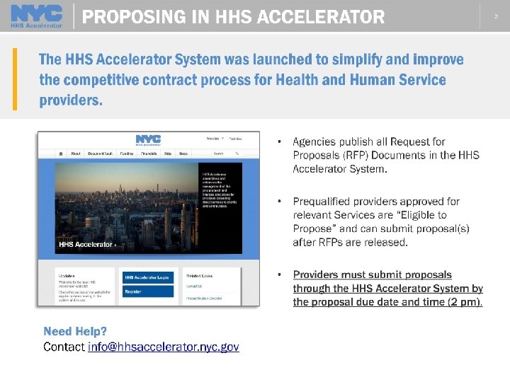 RFP Timeline • Proposal Due Date: October 6, 2016 at 2: 00 pm • Anticipated start date: July 1, 2017 • Contract term will be for three years with an option to renew for up to three additional years. • Questions: RFPquestions@dycd. nyc. gov Must be received by September 23, 2016.