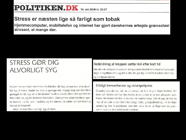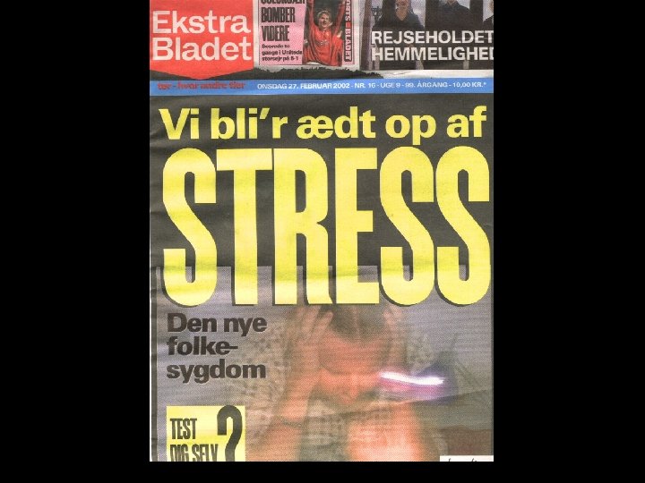 Men der er uklarheder • Hvad er stress? – Stress defineres ofte gennem det spørgsmål, der stilles • Forståelsen af stress ændrer sig gennem tiden – Diskursen omkring stress har ændret sig siden 1987 – Er der prestige i at have et arbejde som omtales som værende stressende? • Medier omtaler (og overdriver) kun negative nyheder om stress • Forhåbentlig kan dagen i dag være med til at give lidt mere klarhed over stress og stresshåndtering