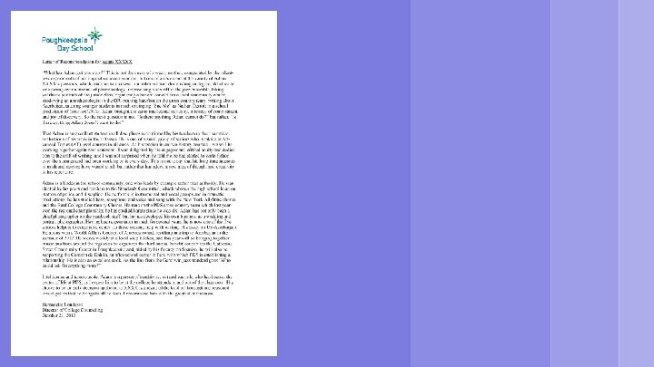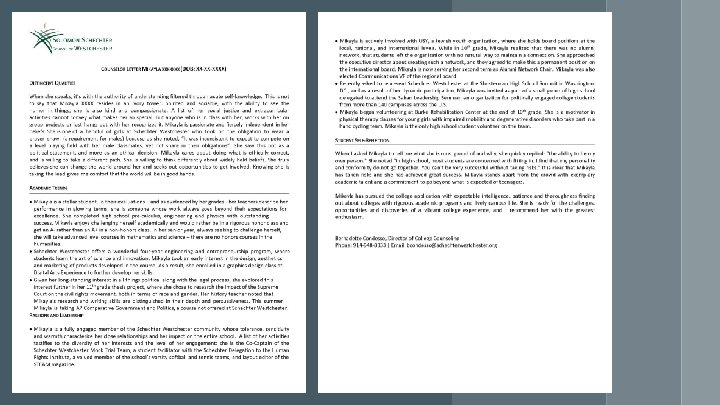 Do ● ● ● ● Dos and don’ts? Connect the dots Provide evidence to support your argument Be both honest and supportive Draw conclusions Tell a story: a word picture Explain extenuating circumstances (with permission) Be brief if possible Don’t ● Repeat your school profile ● Rewrite the resume and transcript in prose ● Overquote teachers, parents, the student ● Assume the colleges will get what’s obvious to you ● Use the boilerplate approach ● Worry too much about general checkboxes