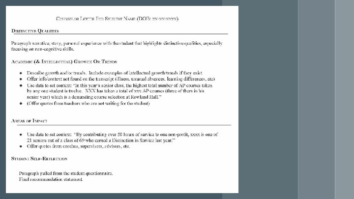Introduction Narrative Middles 3 -5 bullet points 3 sections Academic Highlights Extracurricular Involvement Personal Details Conclusion Superlative comment