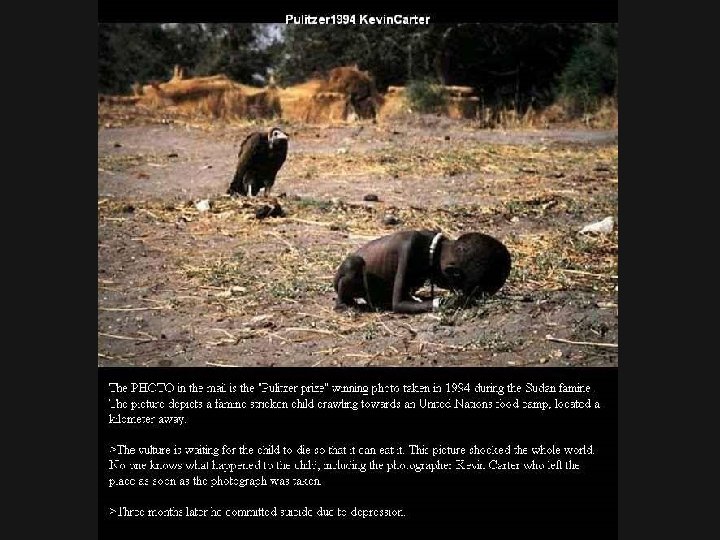 A kép, amely elnyerte a Pulitzer-díjat, 1994 -ben a szudáni éhség idején készült. Egy kisfiút ábrázol, amint éppen az éhezés általt kialakult gyengeség miatt térden csúszva közeledik az Egyesült Nemzetek egy kilóméterre lévő tábora felé. A keselyű arra várakozik, hogy a gyermek meghaljon, és ő megehesse. Ez a kép az egész világot megdöbbentette. Senki sem tudja, mi történt később a gyerekkel, még maga a fotós Kevin Cartner sem, aki a kép elkészülte után egyből távozott. Három hónappal később a megrázkódtatások miatt öngyilkos lett.