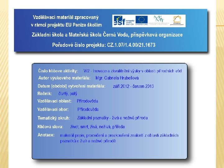 Název školy Adresa školy Číslo projektu Číslo materiálu v sadě Předmět Živá a neživá příroda Téma (název prezentace) AZ Kvíz - 3. -5. ročník Autor Gabriela Hrubešová Metodický popis (anotace) Opakování nabytých poznatků hravou formou – 3. - 5. ročník ZŠ Hra je určená pro dvě družstva nebo dva žáky – červené x modré Po kliknutí na tlačítko s číslicí se zobrazí otázka, s otázkou se zároveň zobrazí napovídající písmeno správné odpovědi. Po kliknutí na tlačítko „odpověď“ se zobrazí správná odpověď. Kliknutím na domeček se vrátíte zpět k základnímu trojúhelníku. Po návratu zpět se tlačítko automaticky zbarví šedě. Při špatné odpovědi necháváme políčko šedé. Při správné odpovědi klikneme opět na políčko – jednou nebo dvakrát – podle požadované barvy. Družstvo si může vybrat i šedé políčko - při výběru šedého políčka zadává vyučující náhradní otázku. • Cílem hry je spojit 3 strany trojúhelníku.