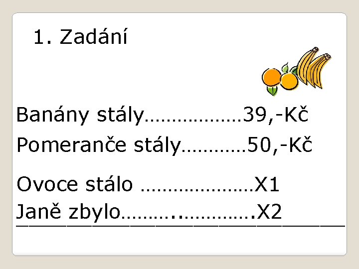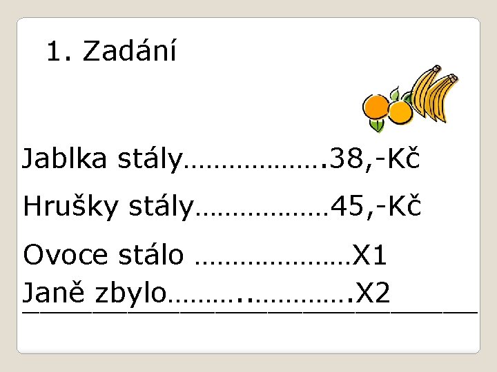 2. Odpověď 1. Ovoce stálo dohromady 83, -Kč. 2. Janě zbylo 17, -Kč.