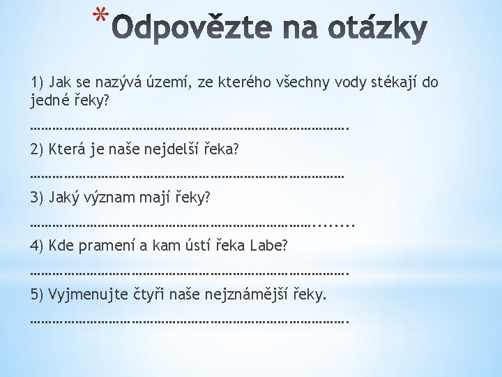 6) Které nejznámější přehrady jsou postaveny na Vltavě? …………………………………… 7) Jaký význam mají přehrady? ……………………………………. 8) Napište oblast a názvy nejznámějších jezer. …………………………………. 9) Do kterých moří odvádějí vodu řeky pramenící v ČR? …………………………………… 10) V které oblasti se nacházejí naše nejznámější rybníky a který je největší? …………………………………………. .