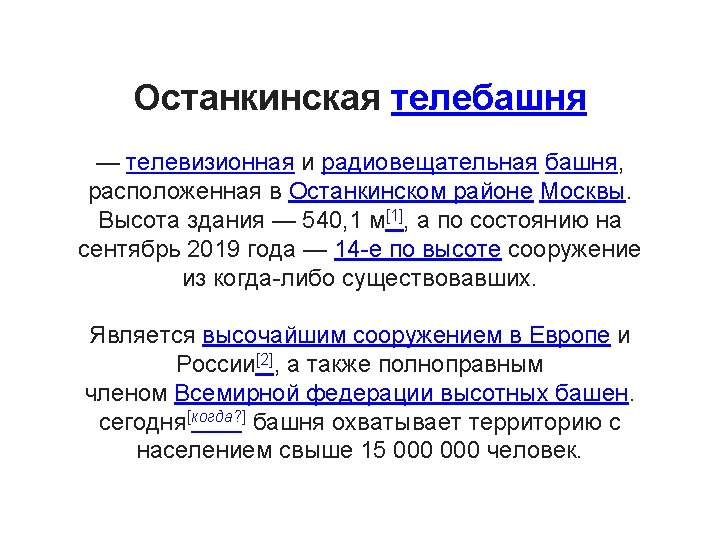 Celková výška televizní věže Ostankino (Останкинская телебашня) je 540 metů. Je to nejvyšší samostatně stojící stavba v Evropě. Prvních deset let své existence, až do výstavby CN Toweru v Torontu, byla i nejvyšší na celém světě. Co se týká technicko - funkčních možností věže, vybavenosti televizní technikou a zařízením, možnostmi regionálního využití a kapacity vnitřních prostorů vzhledem k výšce stavby nemá Ostankino na světě konkurenci. Její celková hmotnost je kolem 51 400 tun. Spousta místa Tato grandiózní stavba má 45 pater, desítky kruhových ochozů a balkónů. Celkový využitelný prostor místností ve spodní vnitřní části kónického tvaru věže, železobetonové konstrukce a výškových obestavění sloužících k rozmístění zařízení a k jiným účelům, skýtá více než 70 000 m 2. Celkový užitný prostor samotných místností je vyšší než 15 000 m 2. Ostankino se vypíná k nebi v severní části Moskvy. Její výstavba započala v roce 1963 a byla dokončena o 54 měsíců později, tj. v roce 1968.