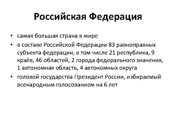 Název Ruské reálie - Ruská federace Předmět, ročník Ruský jazyk, 2. – 4. ročník Tematická oblast Ruské reálie Anotace Prezentace v ruském jazyce s výkladem a obrazovým materiálem o Ruské federaci Klíčová slova Ruská federace, rozloha, poloha, státní symboly, administrativní členění, sousední státy, hranice území Autor Mgr. Marce. Ia Barvířová Datum 8. 2. 2013 Škola Gymnázium Jana Opletala, Litovel, Opletalova 189 Projekt EU peníze středním školám, reg. č. : CZ. 1. 07/1. 5. 00/34. 0221