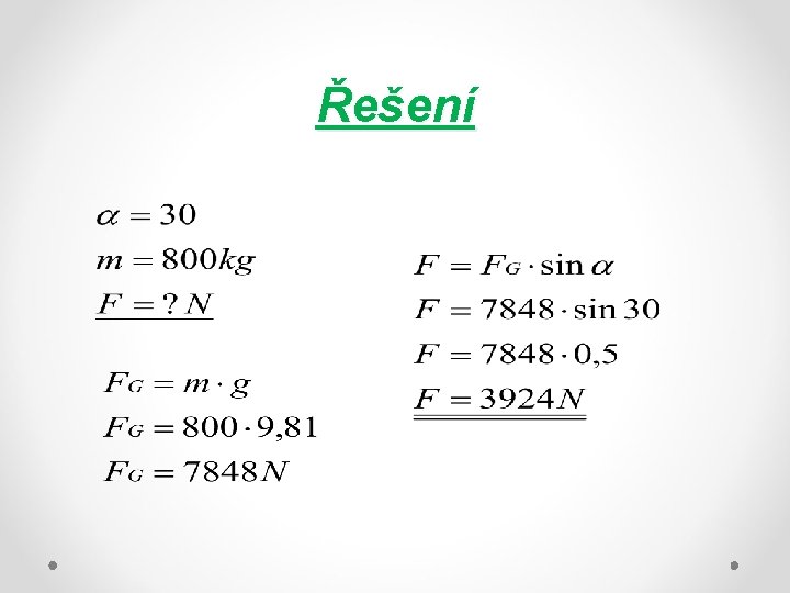 Příklad 1 • Těleso klouže dolů po nakloněné rovině svírající s vodorovnou rovinou úhel 30 o. Jak velkou silou rovnoběžnou s nakloněnou rovinou udržíme v rovnováze těleso o hmotnosti 800 kg?