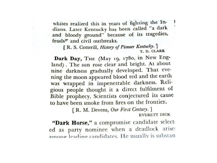 “ Único ou quase único em sua espécie pelo misterioso e até agora inexplicado fenômeno que nele se verificou. . . Foi o dia escuro de 19 de maio de 1780 de inexplicável escuridão que cobriu todo o céu e atmosfera visíveis em Nova Inglaterra. ” Nosso Primeiro Século, R. M. Devens - O Grande Conflito, 306 “Desde o tempo de Moisés, nenhum período de trevas e igual densidade, extensão e duração, já se registrou. ” GC, 307