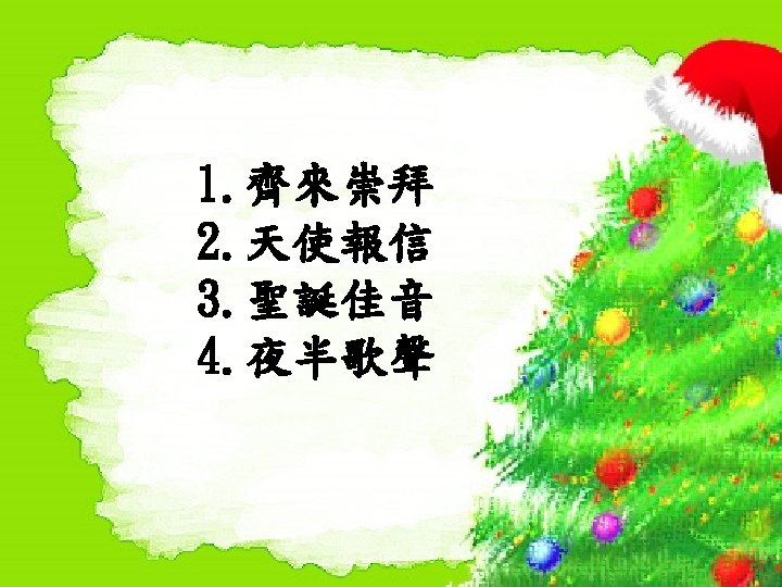 天使報信 Hark!The Herald Angles Sing 1. 聽阿!天使高聲唱 Hark!The herald angels sing 榮耀歸與新生王 Glory to the newborn King 地上平安人蒙恩 Peace on earth, and mercy mild 神人和好再相親 God and sinners reconciled