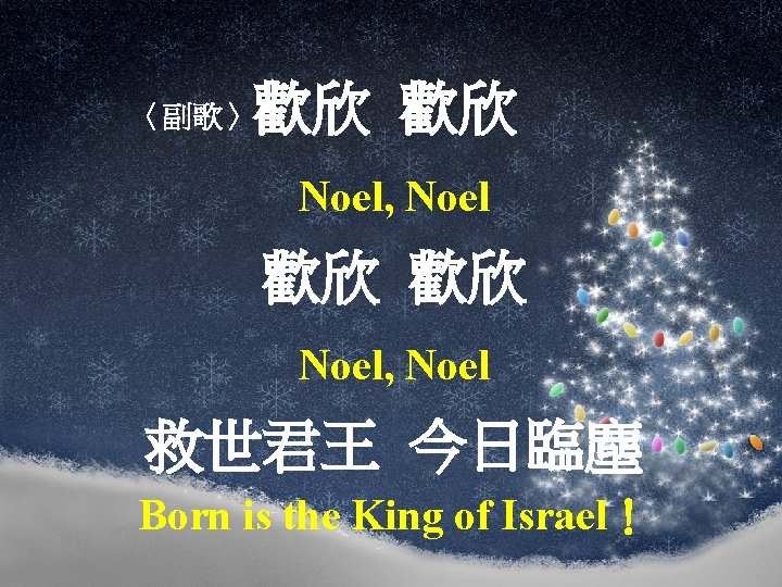 興起 地上大小邦 Joyful, all ye nations, rise 響應諸天共頌揚 Join the triumph of the skies 樂與天使同宣告 With angelic hosts proclaim 基督生於伯利恆 Christ is born in Bethlehem