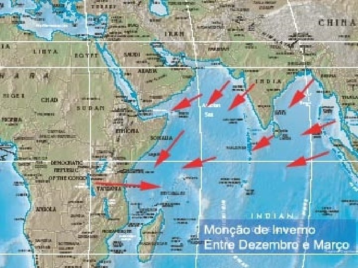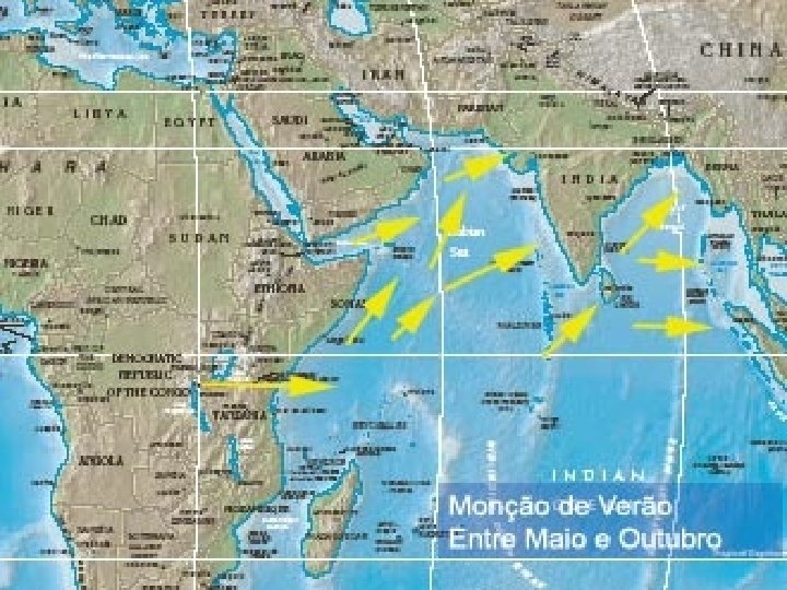 MONÇÕES l Durante o verão a porção continental da Ásia meridional absorve muito calor, principalmente a Índia, tornando-se uma área de ZBP e o oceano índico uma ZAP. Em função disso os ventos sopram do mar para o continente, trazendo umidade e provocando chuvas. (Verões quentes e chuvosos) l Durante o inverno ocorre o processo inverso, as altas temperaturas concentram-se nos oceanos, transformando-os em ZBP e a porção sólida do continente em ZAP, por conseguinte os ventos sopram do continente para o oceano. (Invernos frios e secos)
