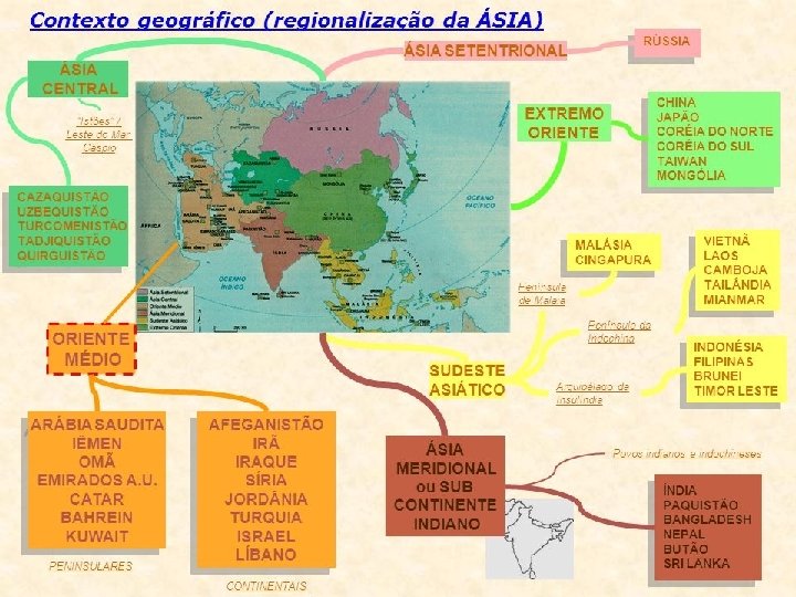 l O maior continente do mundo possui uma divisão bem diferenciada. São seis regiões que compõem à Ásia, delimitando as áreas geoeconômicas do continente asiático: ÁSIA CENTRAL, EXTREMO ORIENTE, NORTE DA ÁSIA, ORIENTE MÉDIO, SUDESTE ASIÁTICO E SUL DA ÁSIA.