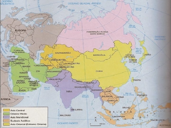 Ásia: divisão regional • O continente asiático é composto por 45 países. • Os mesmos podem ser agrupados, de acordo com suas características físicas, culturais, étnicas e econômicas, em 6 grupos.