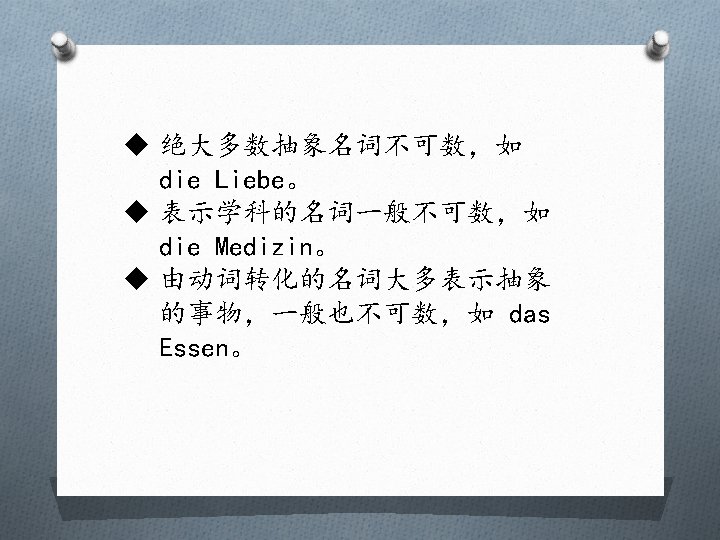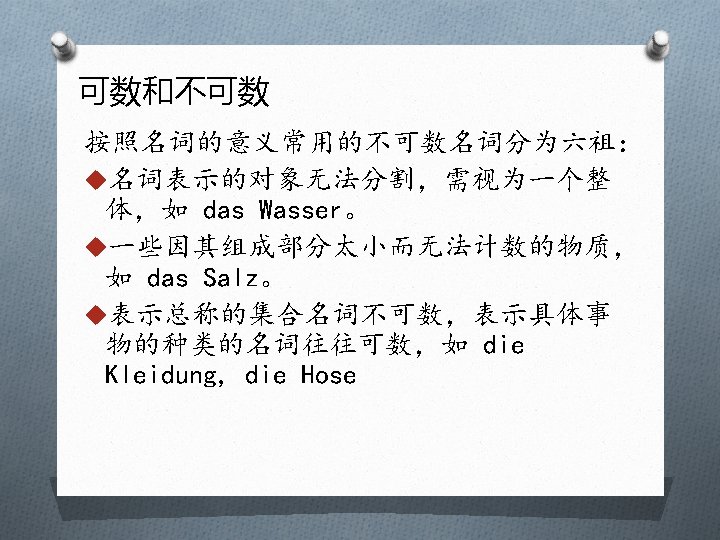 自然性和词性 从语义角度分析词性,主要看自 然性和语法词性之间的关联。现代德 语中,某些名词类别的词性和生物的 自然性别有关系,如: O der Mann die Frau der Onkel die Tante der Herr die Dame der Stier die Kuh der Hahn die Henne der Hengst die Stute das Kind das Baby das Küken das Ferkel das Fohlen