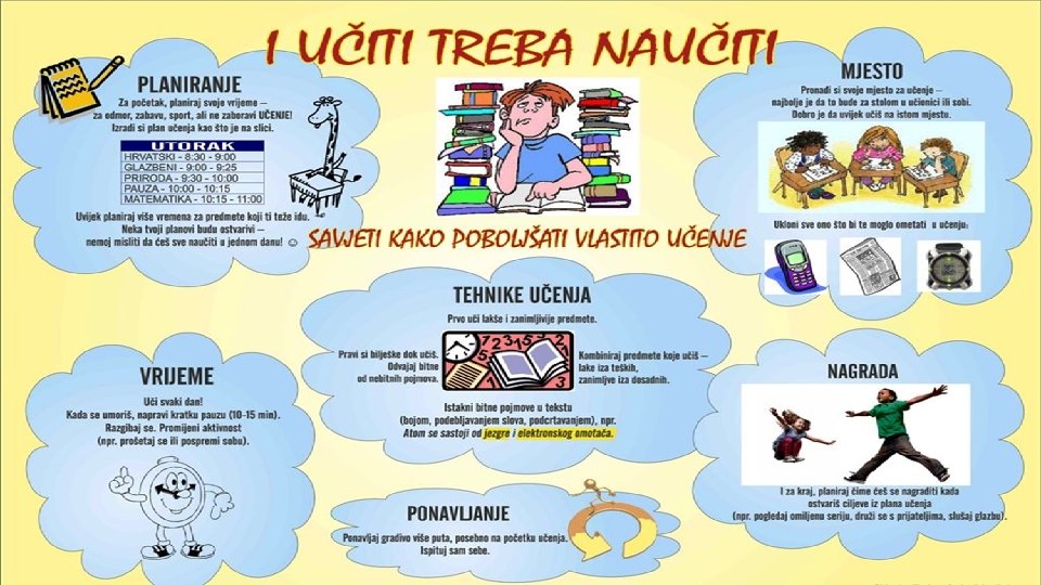 b) Organizirati vrijeme Važno je pomoći djeci u organizaciji vremena Vrijeme nije tvoj ničije. A e. Nije li je organiza cija vrem ena ono što j e u tvoji rukama. m Potaknuti ih da si postavljaju pitanja: • Koliko toga imam za naučiti? • Koliko vremena imam na raspolaganju? • Koje su moje školske i izvanškolske obaveze za ovaj mjesec/tjedan? Savjeti za organizaciju vremena: • • Ne ostavljati sve za zadnji čas Ne pokušavati naučiti sve odjednom Ne žuriti Napraviti plan: mjesečni, tjedni, dnevni