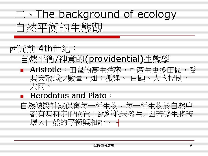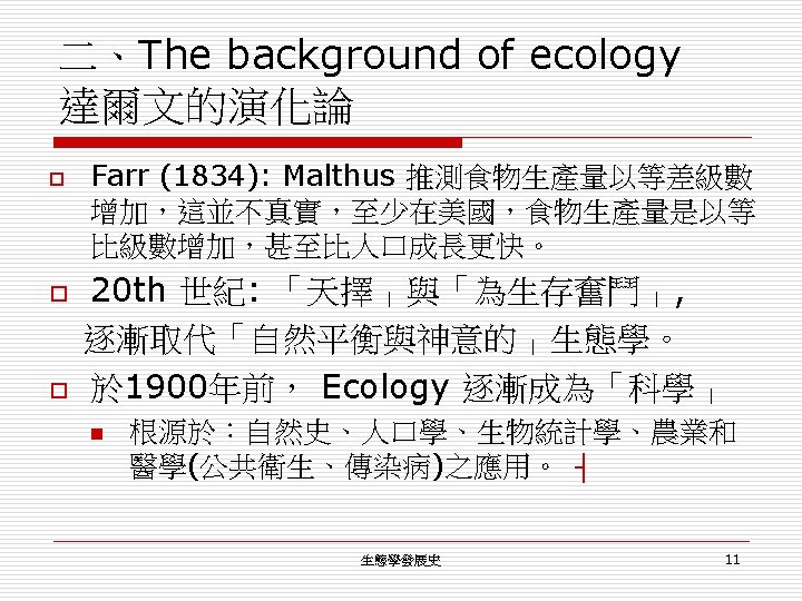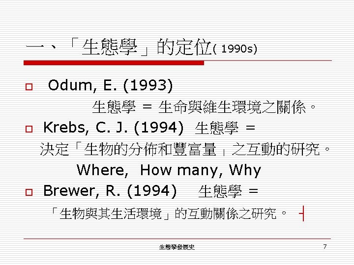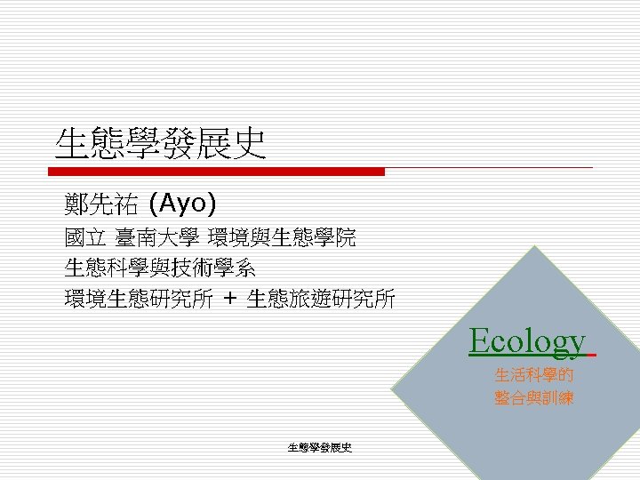 一、「生態學」的定位(起源) o 第一個使用 ecology (Haeckel, E. , 1866)。 n o 名詞:Ecology n n n o Ecology as a part of physiology (生理學)。 字源取自 eco-nomics (household+management) eco-logy (the study of household) the economy of nautre (自然的經濟)。 內容: n n total relationships of the animal both to its inorganic and its organic environment. complex interrelations referred to by Darwin as the conditions for the struggle for existence. 生態學發展史 2