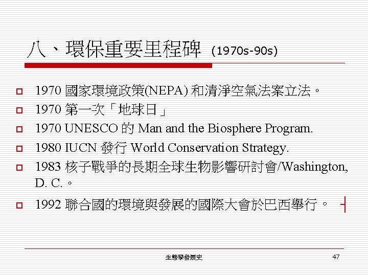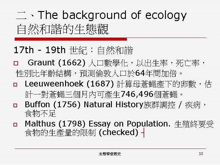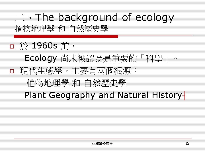 生態學發展史 (一) o o o o o 1970 s Conservation + Landscape + Restoration(復育) 1960 s Ecology 才逐漸被認為是重要的「科學」。 1950 s 各自發展屬於自己領域的「人類生態學」。 1940 s Social ecology + Cultural ecology 1930 s 1920 s 生態學的理論基礎 1910 s Animal Ecology + Human Ecology 1900 s Ecology 成為「生物學」中三大部之一。 1866 Haeckel, Ernst : 第一個使用 Ecology 生態學發展史 50