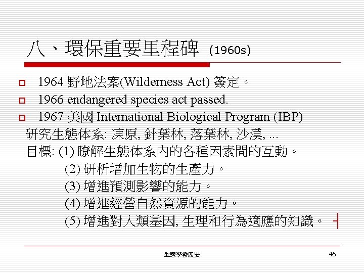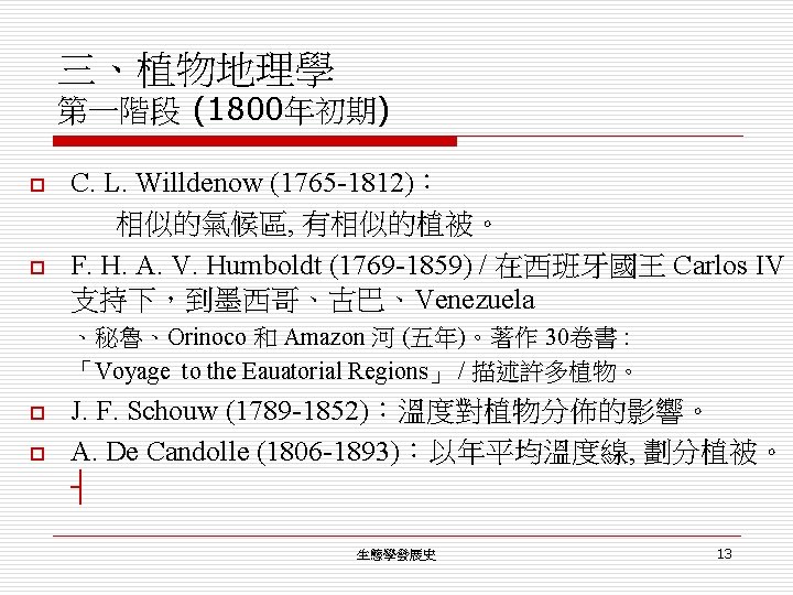 三、植物地理學 第四階段 (1950年以後) 世界: o The International Biological Program (1964 -1974): The biological basis of productivity and human welfare. o energy flow and nutrient cycling in biomes. o The Society for Conservation Biology (1985) 成立發行Conservation Biology (1987 - ) ┤ 生態學發展史 22