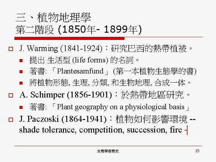 三、植物地理學 第一階段 (1800年初期) o o W. Koppen: Koppen's climate types. A. Kerner (1831 -1898) / 在 Hungary (匈 牙利) 政府支持下,描述 eastern Hungary and Transylvania 地區的植被。 n 著書: 「Plant life of the Danube Basin」 -- 不同海拔高度的植物, 作實驗性的移植。 ┤ 生態學發展史 14