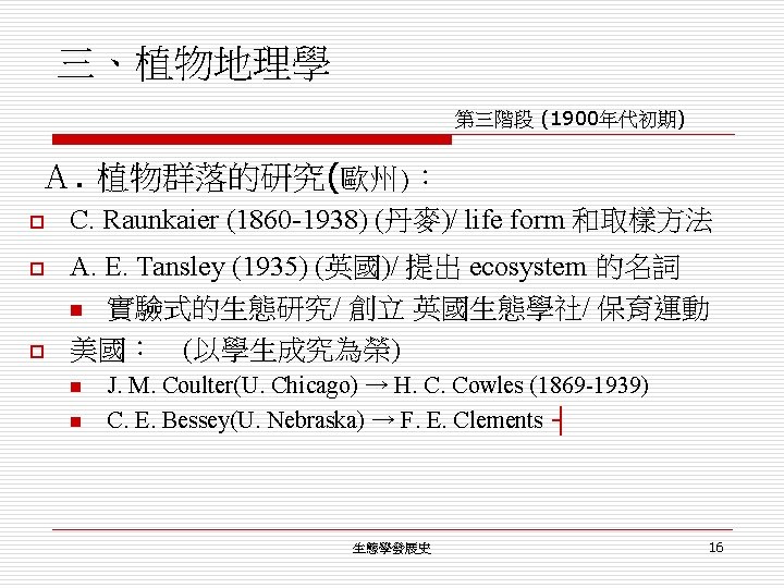 三、植物地理學 第三階段 (1900年代初期) A. 植物群落的研究 (美國) o H. C. Cowles: 研究植物 succession 的先驅 n o (1899) The ecological relations of the vegetation of the sand dunes of lake Michigan. F. E. Clements: 理論學家 n n (1898) The phytogeography of Nebraska. (with R. Pound) (1916) monograph on plant succession. (1929) Plant ecology. (with J. E. Weaver) (1939) Bio-ecology. (with V. E. Shelford) ┤ 生態學發展史 17