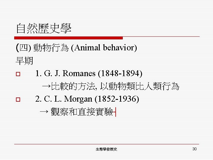 自然歷史學 (三) 動物的研究 (美國): o o C. Adams (1913) A guide to the study of animals. V. Shelford (1913) Animal communities in North America. (三) 動物的研究 (當代): W. C. Allee, A. E. Emerson, T. Park, O. Park and K. P. o Schmidt (1949): 「Principles of animal ecology」. o Modern ecology: trophic structure, energy budgets, population dynamics, natural selection (evolution) ┤ o 生態學發展史 29