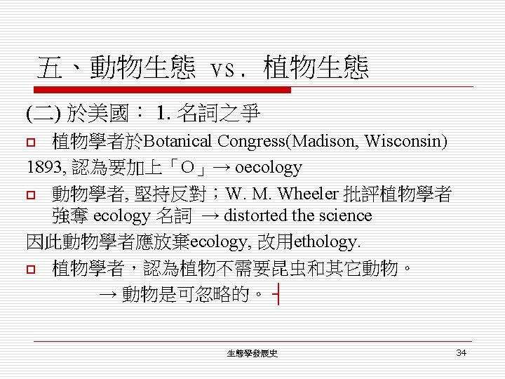 五、動物生態 vs. 植物生態 (二) 於美國: 2. 1940 s. 企圖聯合 o V. E. Shelford (動物)和F. E. Clements (植物) → 「Bio-Ecology」 (1939) o 但 Clements 仍認為: Plants determined the presence of animals and never vice versa. ┤ 生態學發展史 35