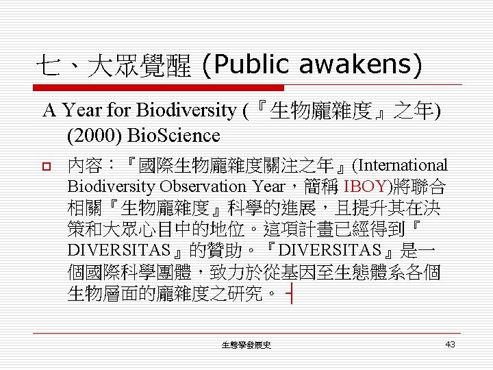 七、大眾覺醒 (Public awakens) P. Shepard and D. Mc. Kinley (1969): The subversive Scinece. o E. Callenbach (1970): Ecotopia. o D. H. Meadows, D. L. Meadows, J. Randers, and o W. W. Berhens III (1972): The limits to growth. o IUCN (1980): World Conservation Strategy. o Council on Environmental Quality (1980): Global 2000 ┤ o 生態學發展史 42