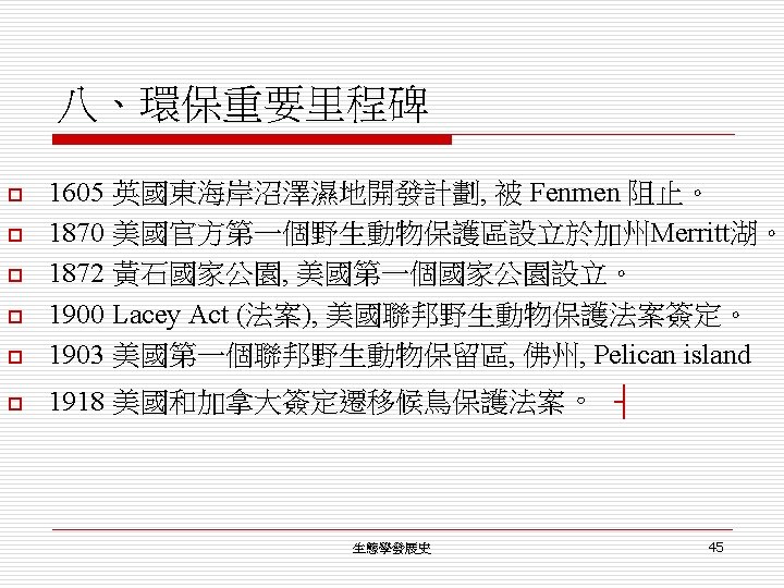 七、大眾覺醒 (Public awakens) 3. 人和環境的研究,追溯至 1800年代。 o G. P. Marsh (1864): Man and Nature. o E. Haeckel (1900): The Riddle of the universe. (1905): The wonders of Life. /back-to-the-land movement /有機農業/土壤和森林保育 o J. Ritchie (1920): The influence of man on animal life in Scotland. ┤ 生態學發展史 40