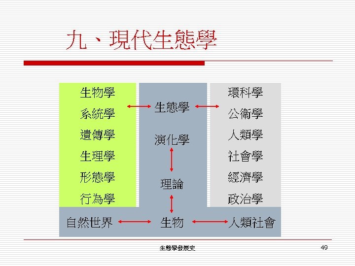 九、現代生態學 o o o 1. 生物: Bird Ecology, Lizard Ecology, Plant Ecology, Fish Ecology, . . 2. 演化: Population Genetics, Evolutionary Ecology 3. 理論: Theoretical Ecology, System Ecology, Ecosystem Ecology, Physiological Ecology, Behavioral Ecology, . . . 4. 環境: Environmental Conservation, Conservation Biology, Landscape Ecology, Geographical Ecology 5. 社會: Social Ecology, Human Ecology, Ecological Impact Assessment, . . . ┤ 生態學發展史 48