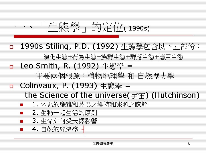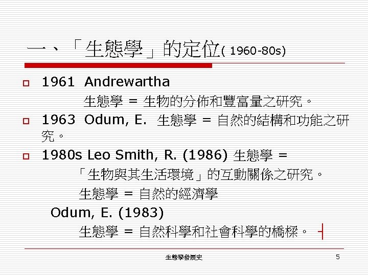 一、「生態學」的定位( by 1950 s) o 1949 Allee et al. principles of animal ecology n =>lack of knowledge of ecology among scholars and philosophers o o n 1. 由於內在的多元性 → 廣泛 distortion of 內容 2. 缺乏 historical studies Kuhn (1970) a developing scientific discipline ==> fusion of several separate trunks lacking a common initial rootstock. ┤ 生態學發展史 4