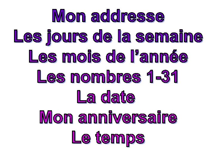 Days of the Week - C’est quel jour aujourd’hui? Aujourd’hui c’est. . . lundi mardi samedi dimanche mercredi jeudi vendredi Months of the Year – Quel mois sommes nous? Nous sommes en. . . janvier février mars avril mai juin juillet août septembre octobre novembre décembre Quel est la date aujourd’hui? (What’s the date today? ) Aujourd’hui c’est vendredi le six août. Quel est le date de ton anniversaire? Mon anniversaire est le seize février. Bon anniversaire! Attention! We say. . . le deux mars, le trois mars etc BUT le premier = the first SO we say. . . le premier mars = the first of March