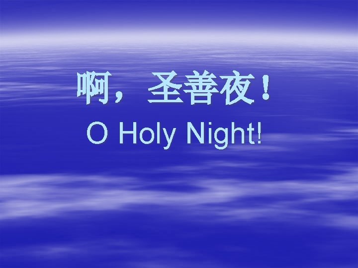啊,圣善夜!众星照耀极光明, 今夜良辰,亲爱救主临尘; 世人沉沦,全地已罪恶贯盈, 直到主来,灵魂自觉宝珍。 O holy night! The stars are brightly shining. It is the night of the dear Savior's birth. Long lay the world in sin and error pining. Till He appeared and the Spirit felt its worth.