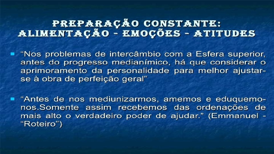 EMOÇÕES E ATITUDES EQUILIBRADAS ▪ Toda vigilância, portanto, é indispensável por parte do medianeiro, especialmente, nos dias destinados às reuniões. ▪ “No dia marcado para as reuniões mediúnicas, os integrantes da equipe precisam, a rigor, cultivar atitude mental digna, desde cedo. ▪ Ao despertar pela manhã, o dirigente, todos devem elevar o nível do pensamento, seja orando ou acolhendo ideias de natureza superior. ▪ Intenções e palavras puras, atitudes e ações limpas. ▪ Trata-se de preparação adequada a assunto grave: ▪ A assistência a desencarnados menos felizes, com a supervisão de instrutores da Vida Espiritual.