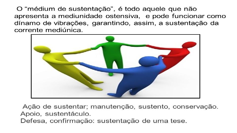 O MÉDIUM DE SUSTENTAÇÃO ▪ Podemos designar, por meio da denominação “médium de sustentação”, todo aquele que, por não apresentar a mediunidade ostensiva, pode funcionar como dínamo de vibrações, garantindo, assim, a sustentação da corrente mediúnica. ▪ Mesmo sendo menor sua participação sob o ponto de vista do fenômeno, a sua contribuição é constante e de suma importância, para a efetivação de toda tarefa mediúnica.