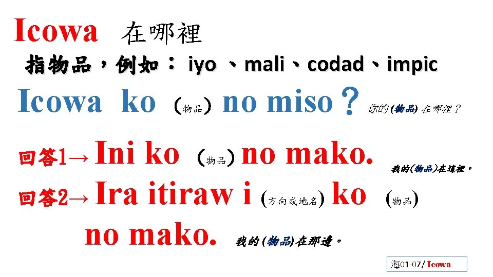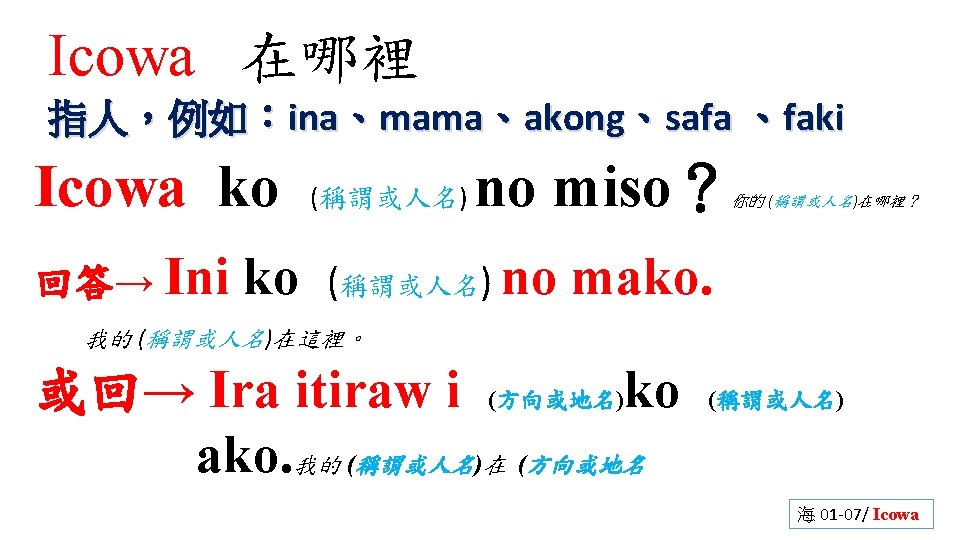 O mitiliday cingra haw 1 Caayay o singsi Slides: 12 Download presentation O mitiliday cingra haw ? 他是學生嗎? 1. Caayay, o singsi cingra. 2. Hai, o mitiliday cingra. 海 01 -02/rew Cima kiso? →Ci(族名) kako 1. . 海 1 -4//rew Katomireg 請起立 Mita’ong! 敬禮 Kamaro’! 請坐下 海 01 -03//rew fa’inayan 男生,男人 fafahiyan 女生,女人 海 01 -05/rew ko he 黑 色 tin ga y kohecalay 白色 e h a K y a g n 海 01 -06 co Maolah kako I tisowanan Maolah kako tisowanan 海 01 -06 song Maolah kako komaen to→tali 、tefos、hana 海 1 -6/maolah Mao: lah kako 人→ 1. cingraan(他/她) 2. tisowanan (你/妳) 3. takowanan(我) 動物→我喜歡狗 → Mao: lah kako to Waco. 海 1 -6/maolah Maolah kako 人→ 1. ciiraan(他/她) 2. tisowanan (你/妳) 3. takowanan(我) 動物→我喜歡狗 → Mao: lah kako to waco. 海 1 -6/maolah