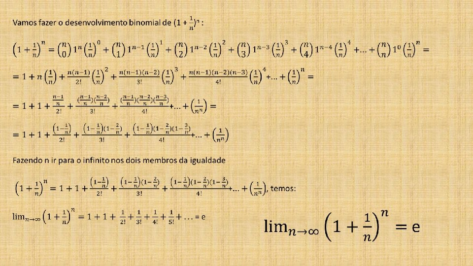 2 < Sn < 3 A sequência Sn é monótona (estritamente crescente) e limitada. Portanto, quando n tende ao infinito, ela converge a um limite. Vamos chamar esse limite de e.