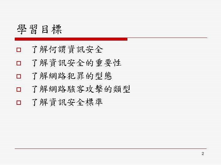 資訊安全標準 o o o CC(Common Criteria)「公共準則」:統一各項準 則。最新標準可參考如下網站: http: //csrc. nist. gov/cc(電腦安全資源中心、Computer Security Resource Center) http: //www. iso. ch(國際標準組織、International Organization of Standardization) HIPAA(Health Insurance Portability and Accountability Act )「健康保險可移植性和可計算 性條例」 http: //www. hipaa. org 12